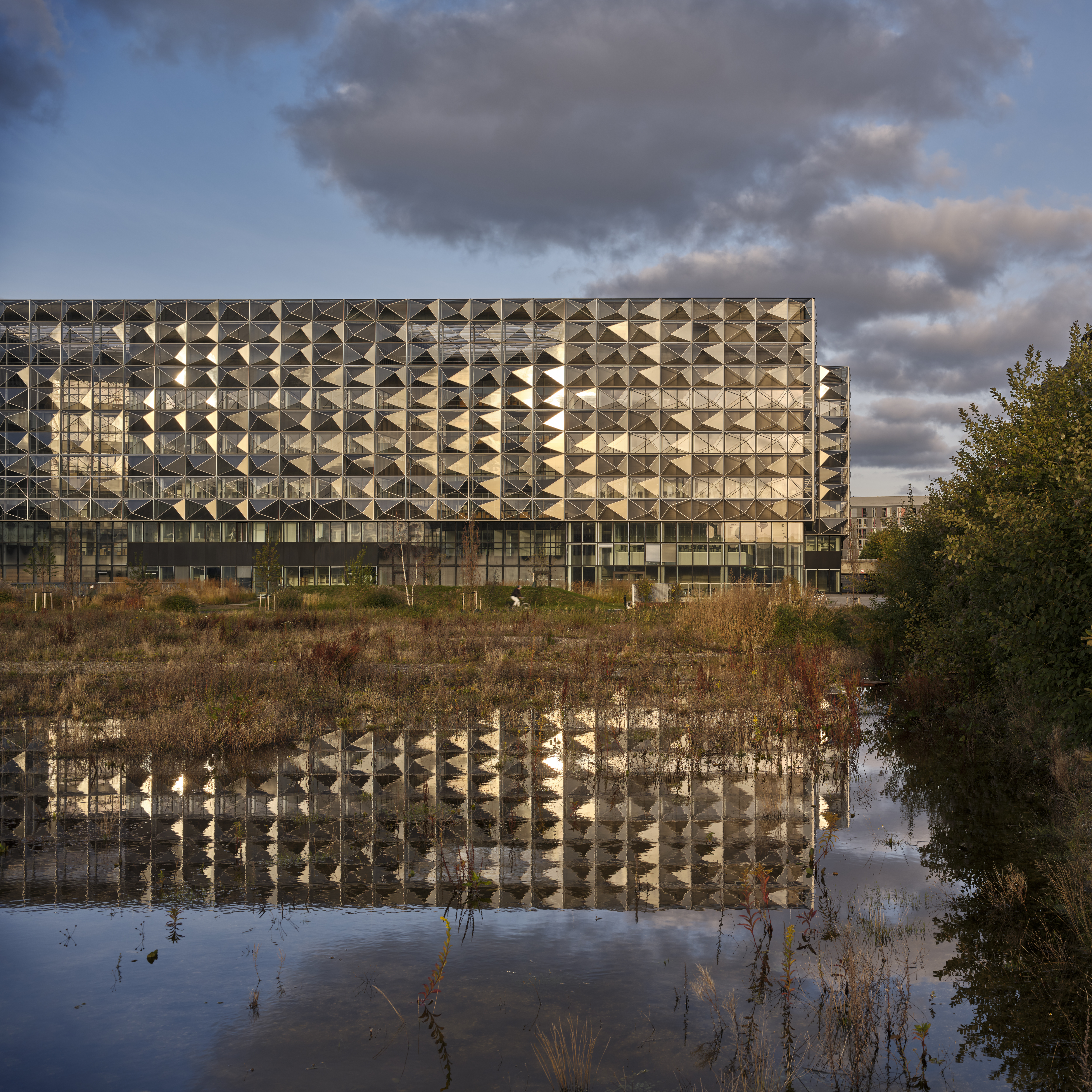 The characteristic, prism-shaped façade, invests NBB with a highly distinctive identity. The secondary, noise-cancelling building envelope reduces transmission losses, and the cavities preheats the air from outside that is drawn into the building.