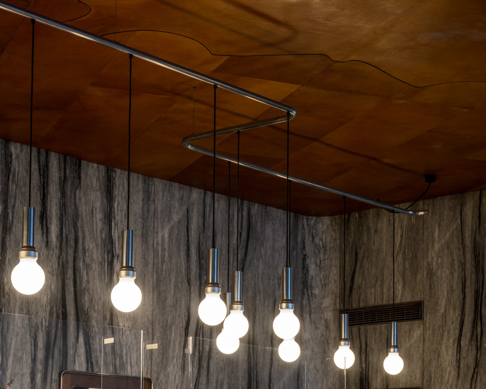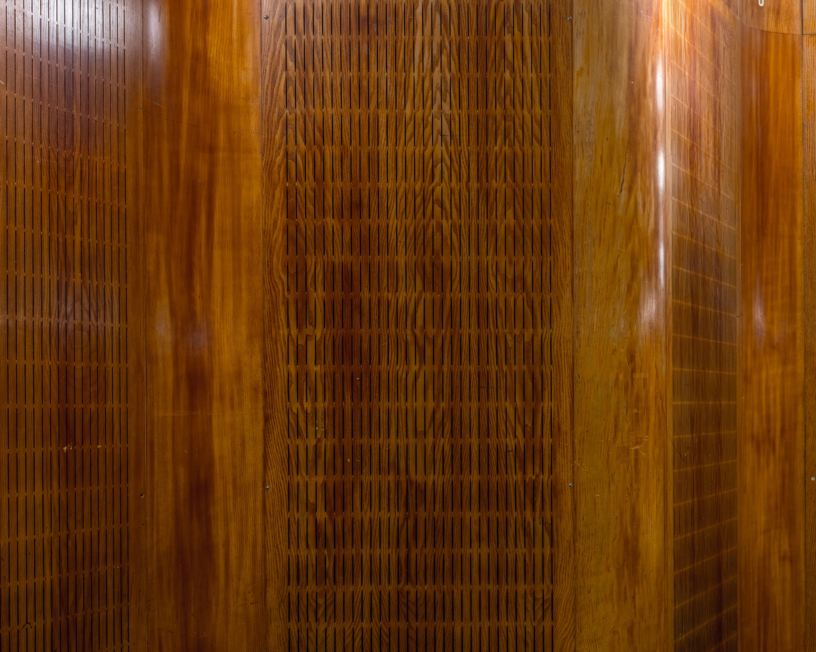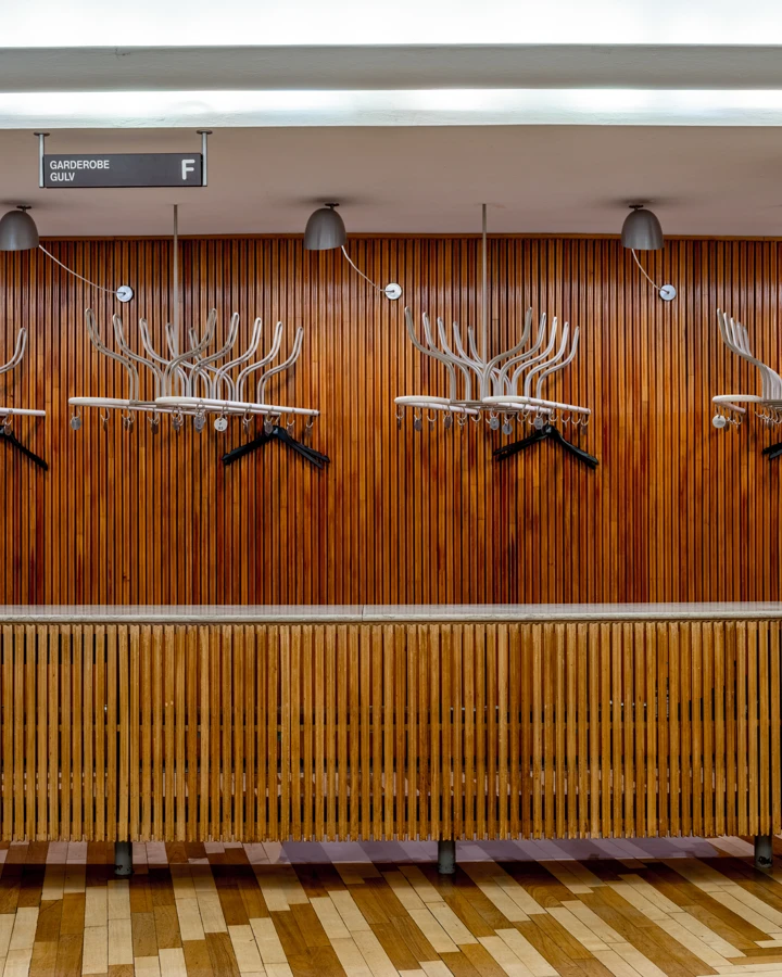 The materials used in the Radio House are exclusive both inside and out. The facades are made of Greenlandic marble, and the furniture and furnishings are designed in materials like dark mahogany. The ceiling in the foyer is divided into sections of oxhide, stretched directly over mineral wool.