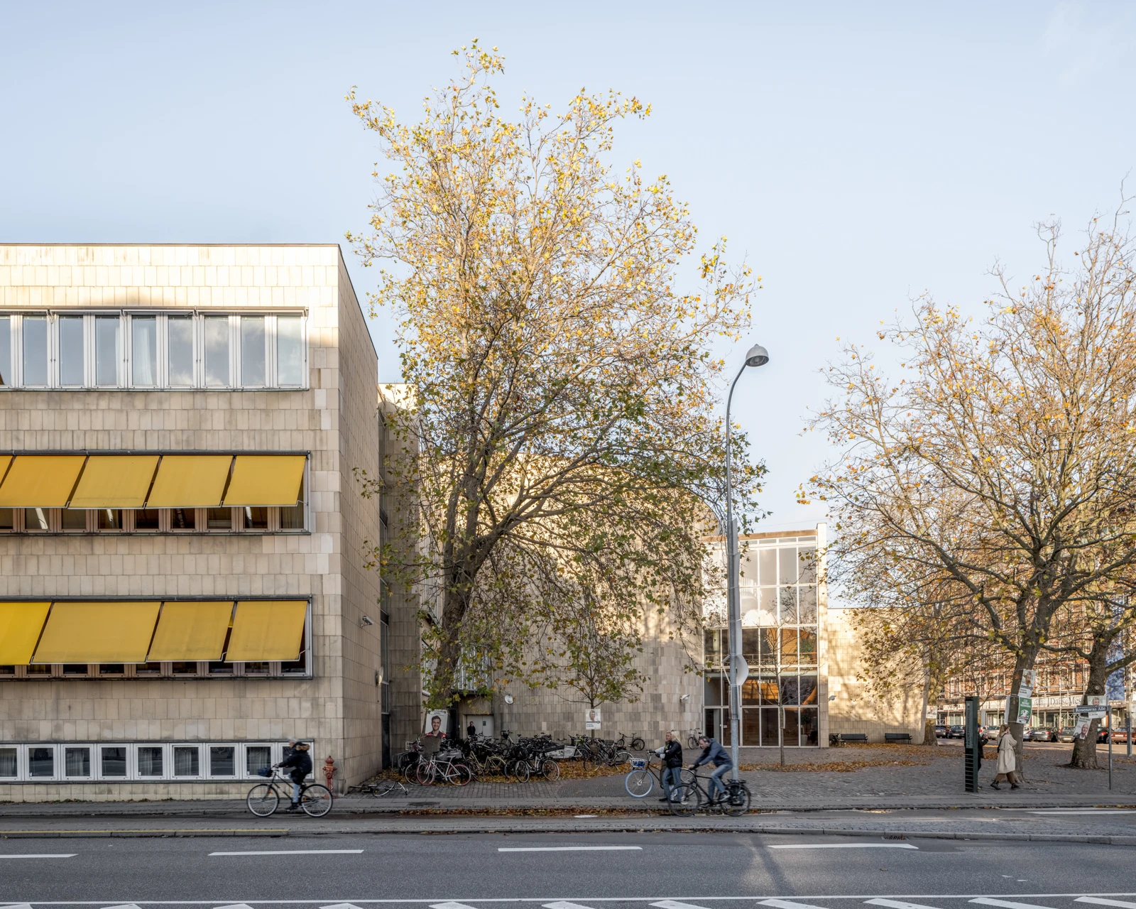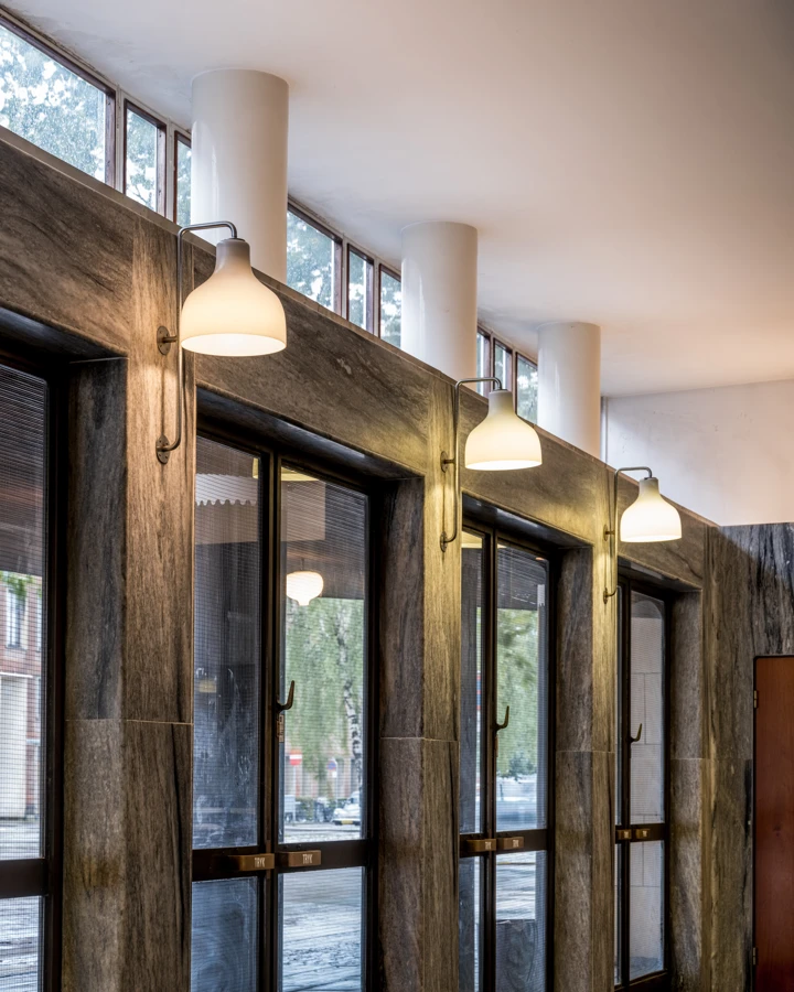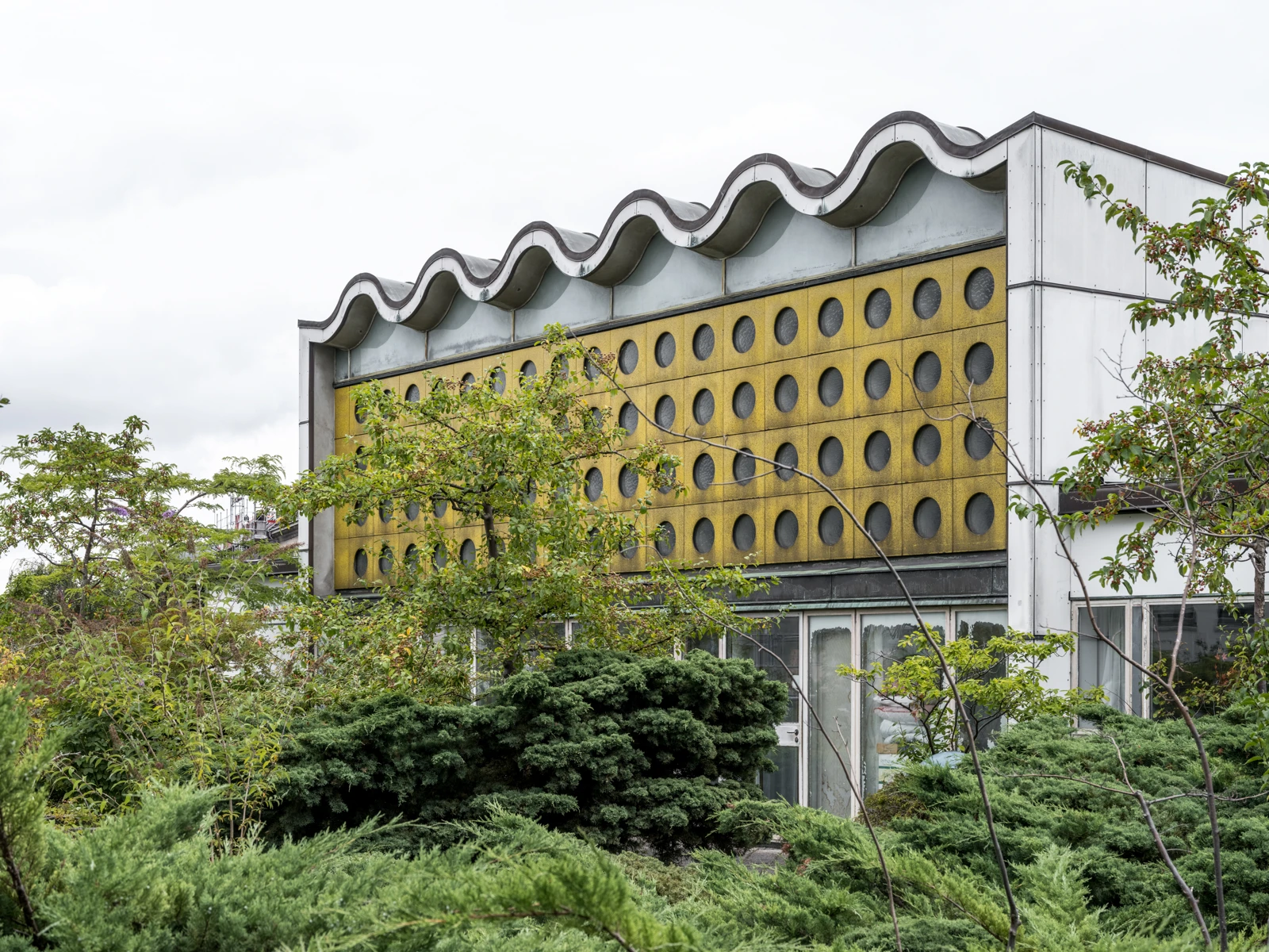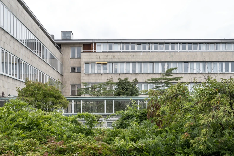 The administration wing is composed of staggered volumes, similar to Arne Jacobsen's town halls in Aarhus and Søllerød, with references to Walter Gropius' competition project for a theater in Kharkov and Le Corbusier's League of Nations building in Geneva from 1927.