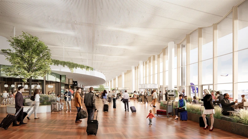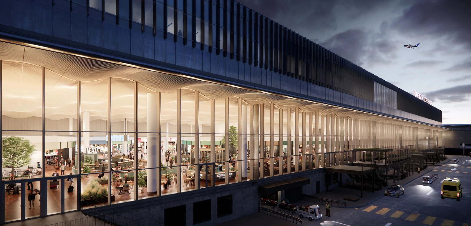 Designed under a single undulating roof, the new expansion combines these qualities. The new terminal area that lets diffuse natural light into the large space under a wavy ceiling that references the first Vilhelm Lauritzen Terminal and the clouds in the sky. Open, green light shafts with hanging plants serve as landmark crevices in the transparent ceiling. They ensure a simultaneous flow of direct sunlight and diffuse daylight.