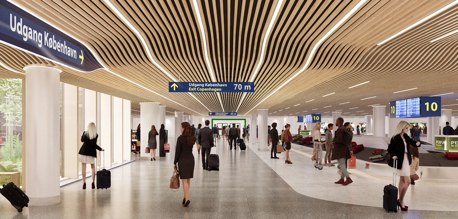 Existing ceilings and floors, central elements of the architecture of the Copenhagen Airport, inspire the expansion design. All airport ceilings tell a story of a consistent focus on quality and aesthetics, combined with a highly technical functionality – such as the undulating ceilings in the Vilhelm Lauritzen Terminal from 1939, the white slats and characteristic round skylights in the 1960 Terminal 2 as well as the arched wings of Terminal 3 from 1998. The high quality flooring is another characteristic feature of the airport, and lends all terminals a coherent expression. The wooden floors on the first floor give travellers a calm, pleasant feel and offer an intuitive sense of location. The baggage reclaim area has granite flooring.