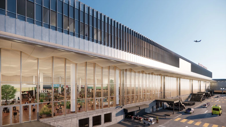 In the evening, the ceiling appear as a single, unified surface reflecting a starry sky. The heart of the terminal is an open space with a large garden that will provide passengers with an intuitive overview and an impressive runway view from the 270-metre-long window section. A suspended, column-free floor divides the space into two levels, continuing the natural integration of the existing architecture.