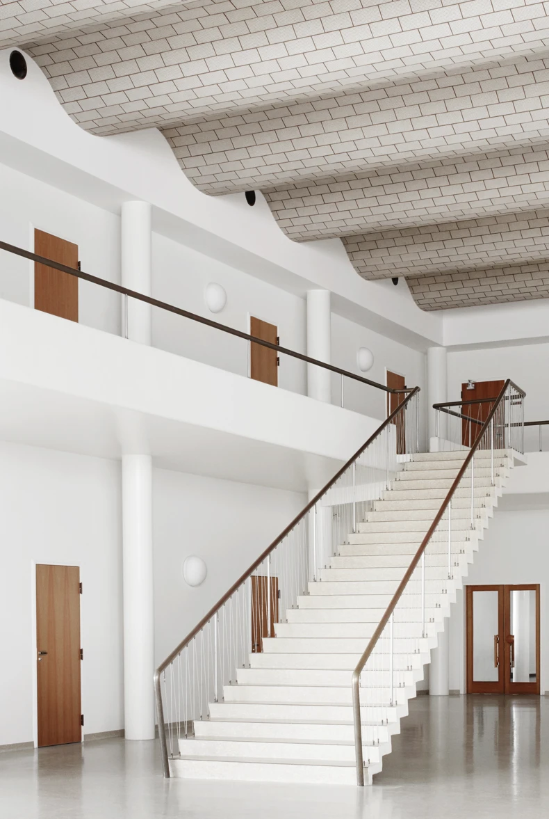 The airport terminal has tactile, visual, and aural qualities, but was not an expensive building like the Radio House. It was made from cheaper, more industrial materials. The striking brass banister on the staircase and the Greenland marble cladding at the entrances are exceptions. Several of the walls are clad with Junker’s beech parquet.