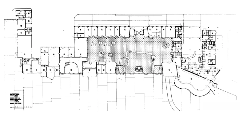 The entrance and exit to the runways are located in one-third of the terminal at one end, lending a sense of gravity to the busiest end of the concourse. The restaurant’s double-curved façade shape is an element that frequently occurs in Lauritzen’s architecture and that of other architects of the time. It can be regarded as a loan from Cubist painters such as Picasso and Braque, whose pictures often feature the outlines of guitars.