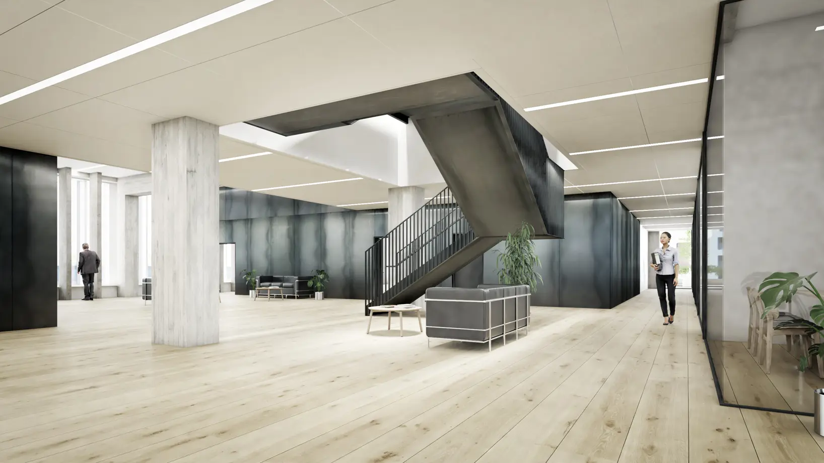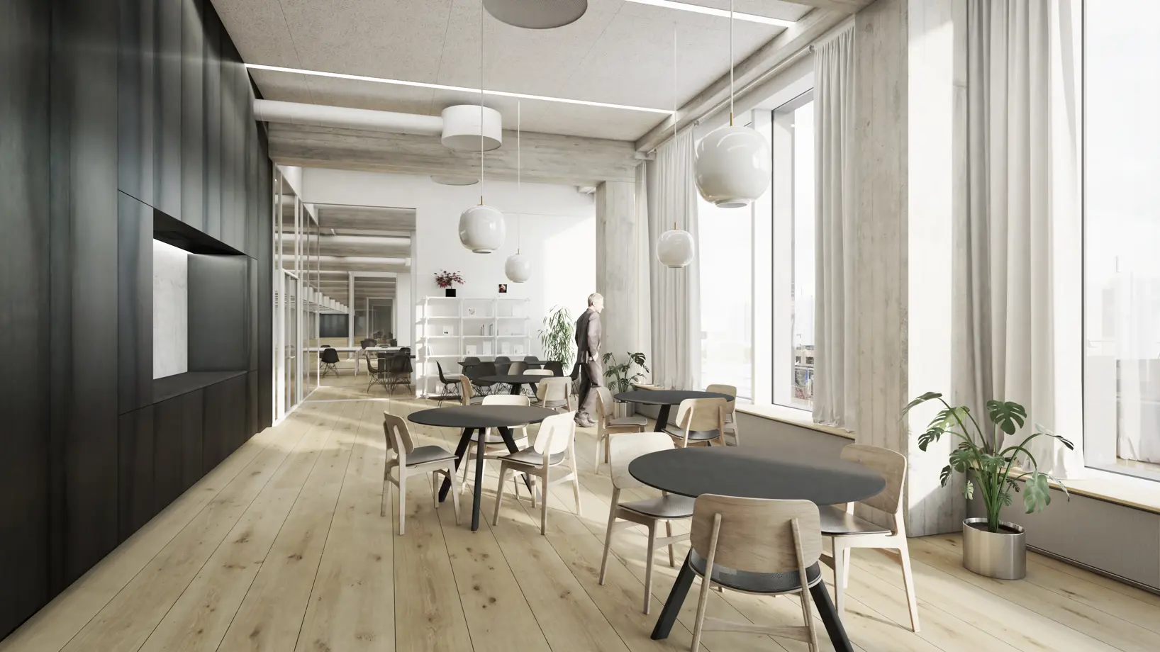 At Kalvebod Brygge 32 in Copenhagen is one of the city’s most well-known brutalist buildings. The 180-meter former freight railway hotel, nicknamed KB32, is in the midst of a transformation into a six-story open office landscape. The Legal Adviser to the Danish Government moves into the almost 30,000 m2, which is characterized by multifunctional interior design, daylight and conscious materials such as wood and raw concrete.