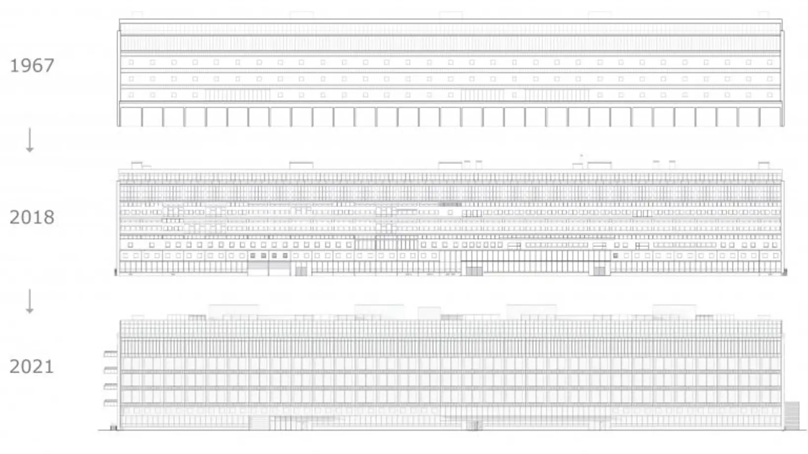 The facade of KB32 in particular has for many years been the subject of great debate among architecture enthusiasts with clear attitudes towards and against the brutalist concrete structure. The original design for DSB Estate from 1967 has been continuously changed over time, and the building ended with a random and incoherent expression.