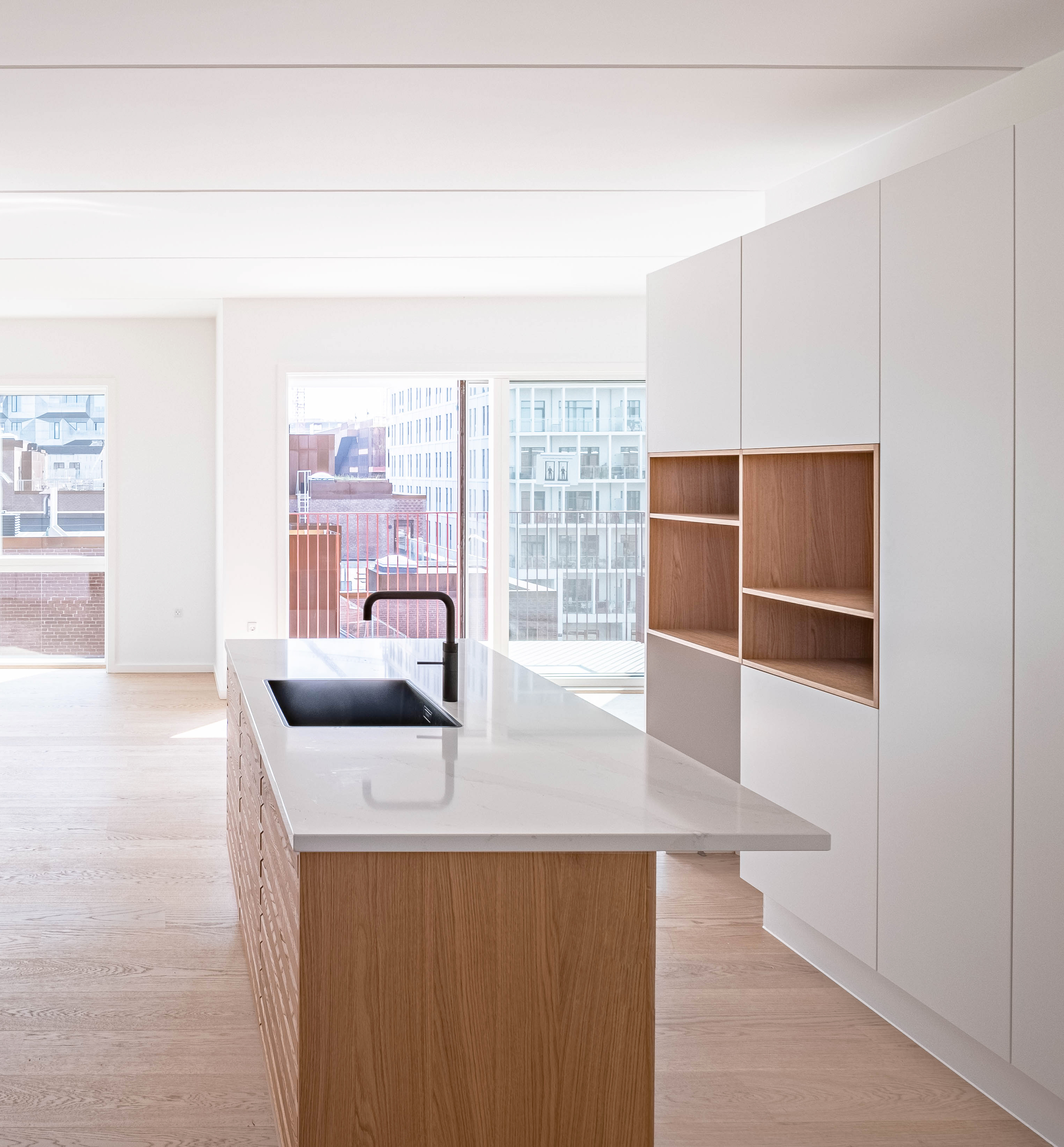 Fortkaj is a modern interpretation of the classic square building known from central Copenhagen urban areas, thus referencing the neighboring Østerbro. The square consists of four angles marked alternately with smooth or relief masonry. The different heights of the buildings create a dynamic expression. This adds modern elements to the classic square structure, whereby Fortkaj illustrates the history of Nordhavn; an intertwining of historical and modern architecture.
