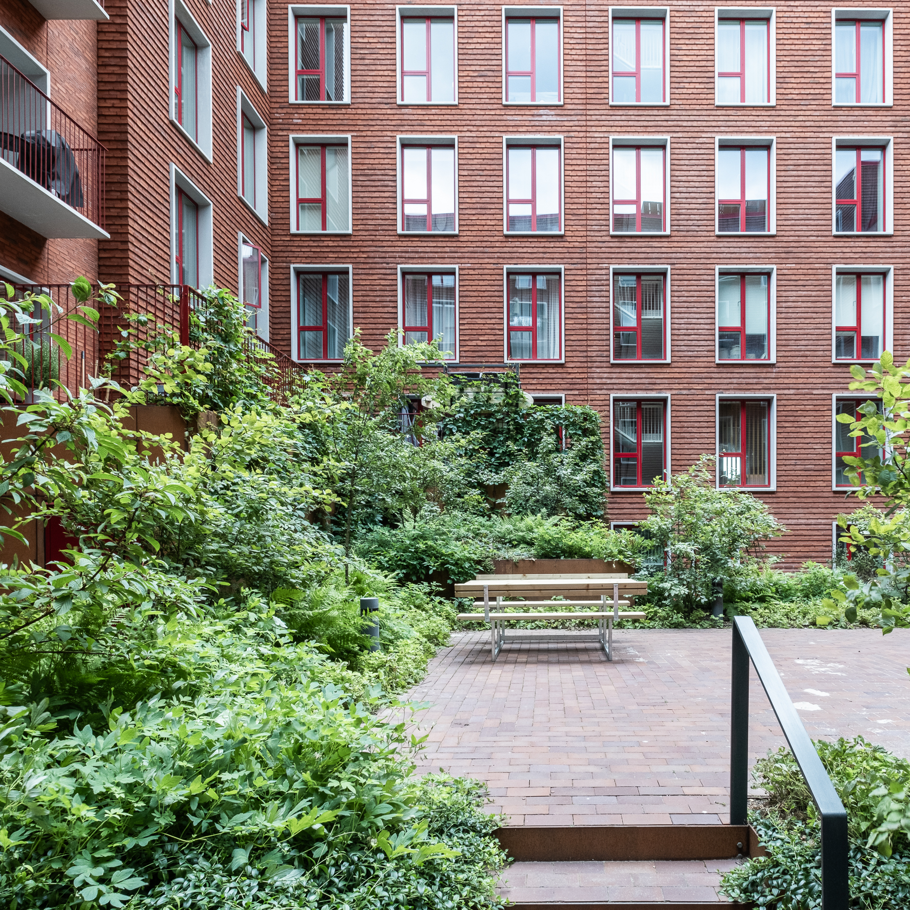 An intimate courtyard with beautiful planting serves as a meeting place, where residents are invited to play and cultivate the small gardens. The courtyard area’s planted raised beds in corten steel play beautifully against the red tiles of the façade.