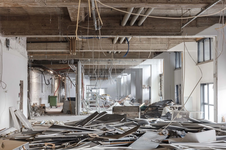 Inside, suspended ceilings have been removed and the building stands with an impressive ceiling height of just under 4.5 meters. Together with the 3.8 meter high window sections, the rooms are opened up and natural daylight is thrown all the way into the deep building, where the original bright, raw concrete beams have been preserved and leave an industrial imprint.