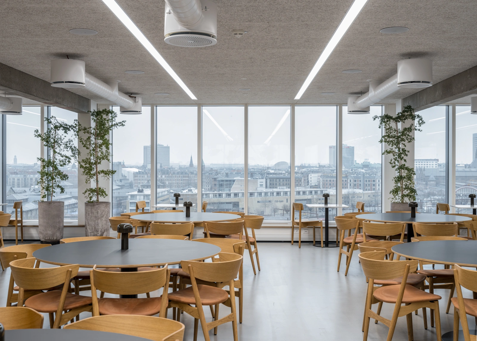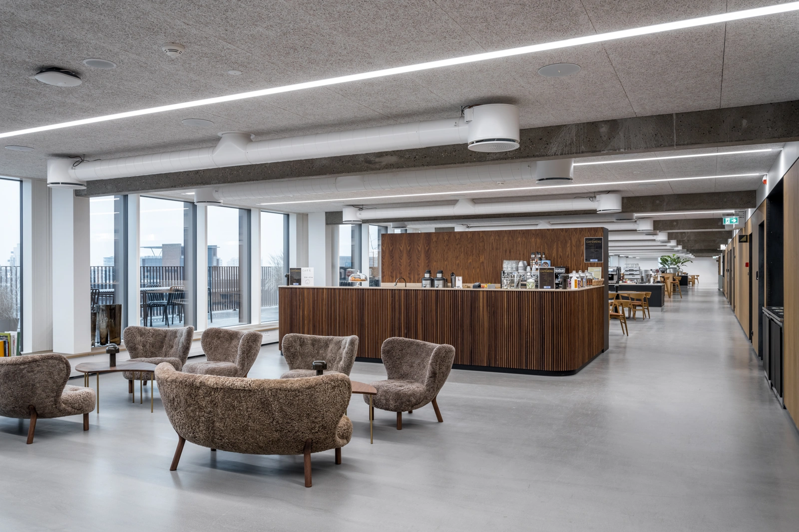 In the project, there has been a special focus on acoustics, where large parts of the building's surfaces are acoustically damped with handmade, micro-perforated hot-rolled steel panels with sound-absorbing material behind. They inscribe themselves in the character of the building and together with the raw concrete elements and solid oak, they create a warm, honest and Nordic atmosphere and experience.