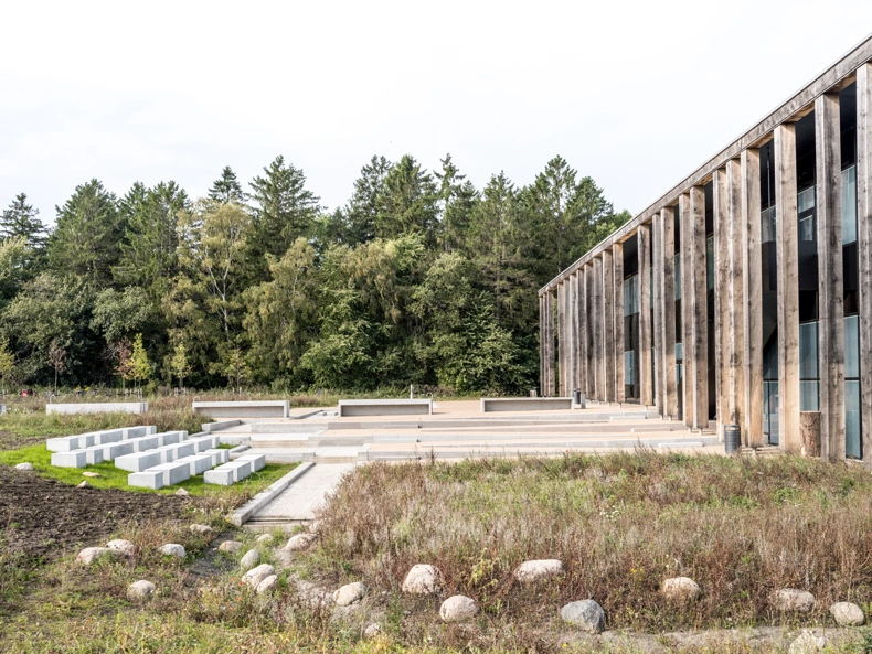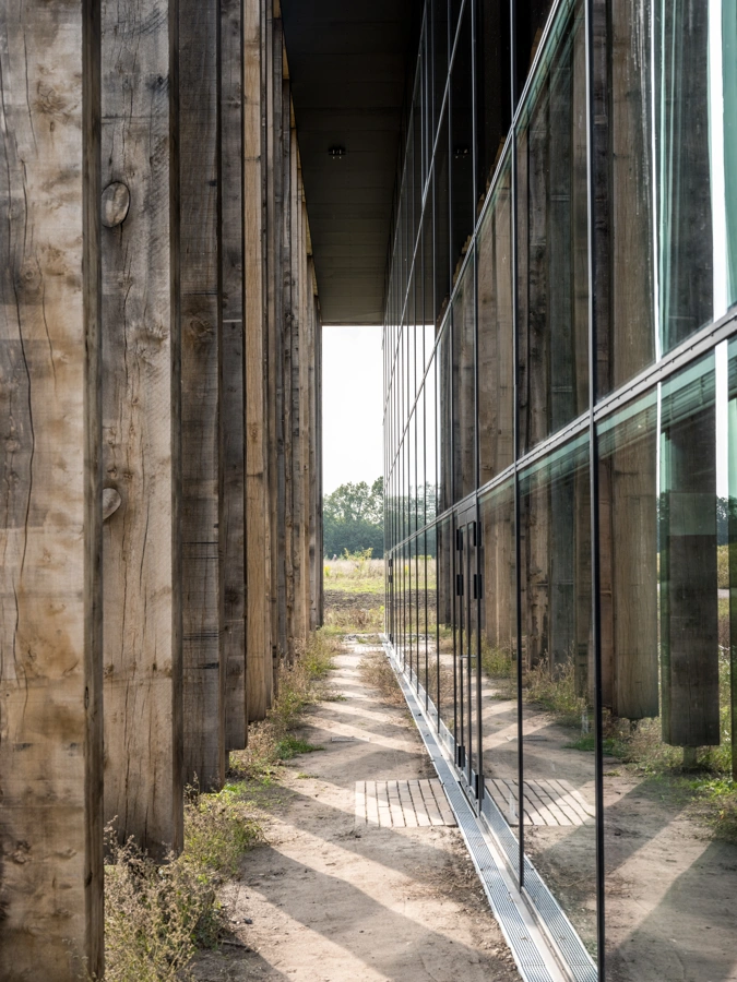 Ninety-six oak columns from 150-year-old trees mark the transition between a living landscape and a living building inspired by the natural surroundings – each placed in a pattern that reference the mathematical pattern of Fibonacci and DNA-strings.