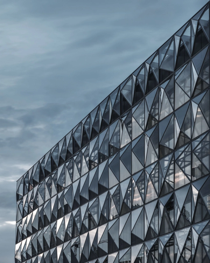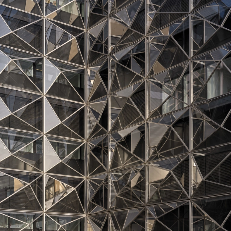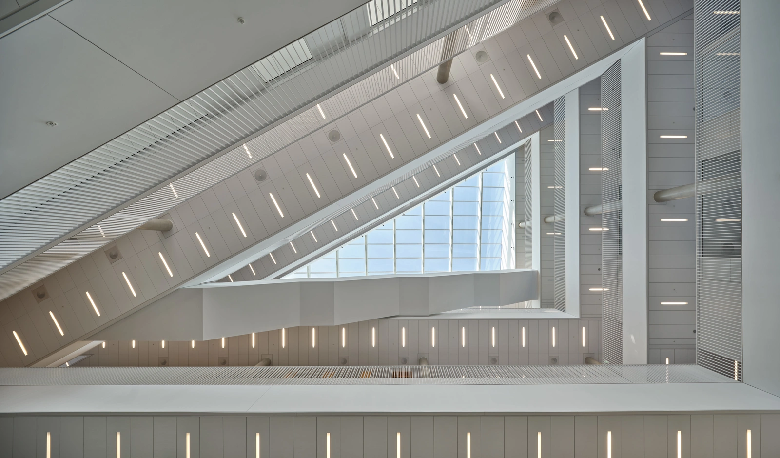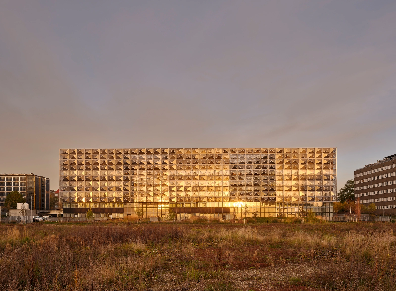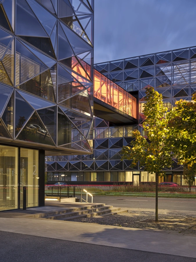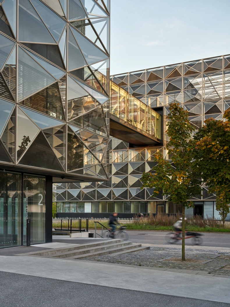 The characteristic, prism-shaped façade, invests NBB with a highly distinctive identity. The secondary, noise-cancelling building envelope reduces transmission losses, and the cavities preheats the air from outside that is drawn into the building.