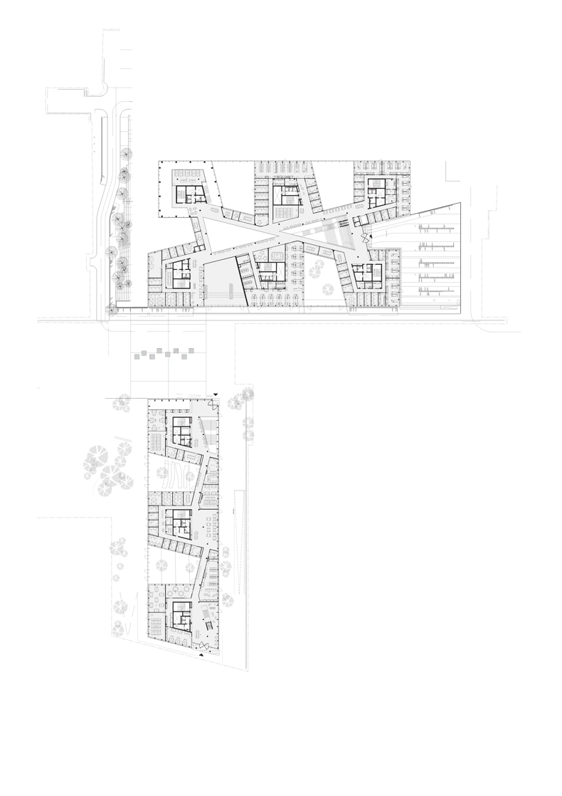The building is structured in 9 vertical units – ‘towers’. Each floor plan in the towers is referred to as a ‘module’, containing offices, laboratories, and support services. Each module is about 600m2: a good size for an independent workplace in a larger community.