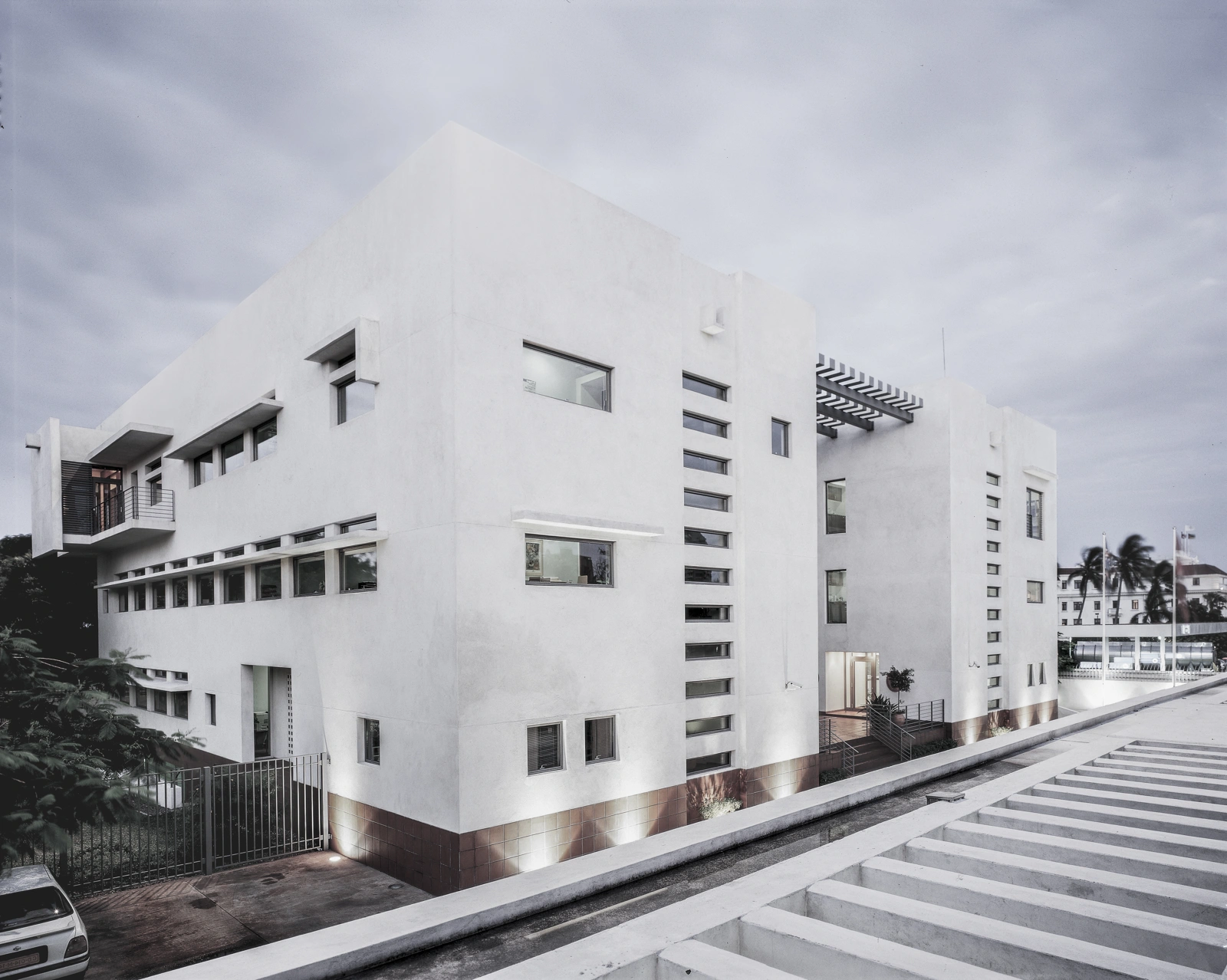 The embassy garden area is a mixed composition of local trees and plants, such as the African flame tree. The white-painted walls encompass the three-winged, terrace brick-tiles, which for the most part are kept cool and shady by a constructive solution.