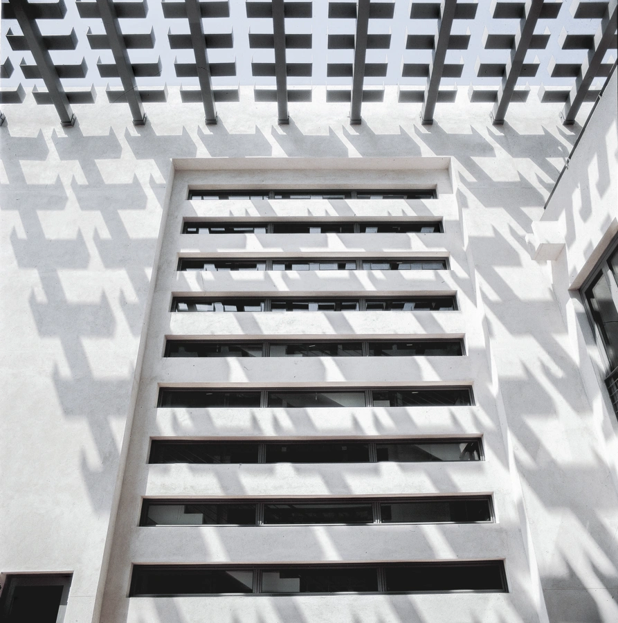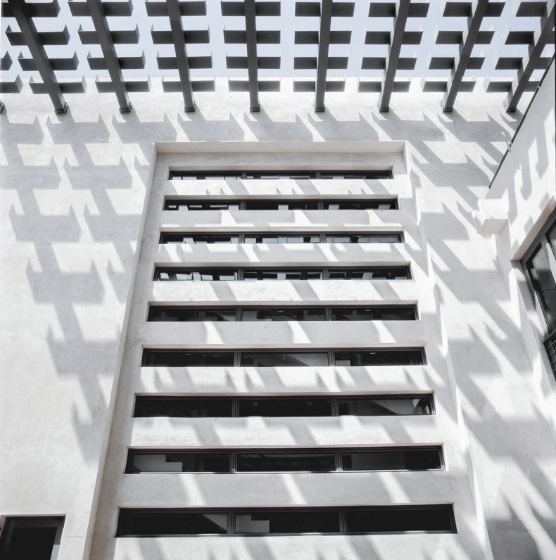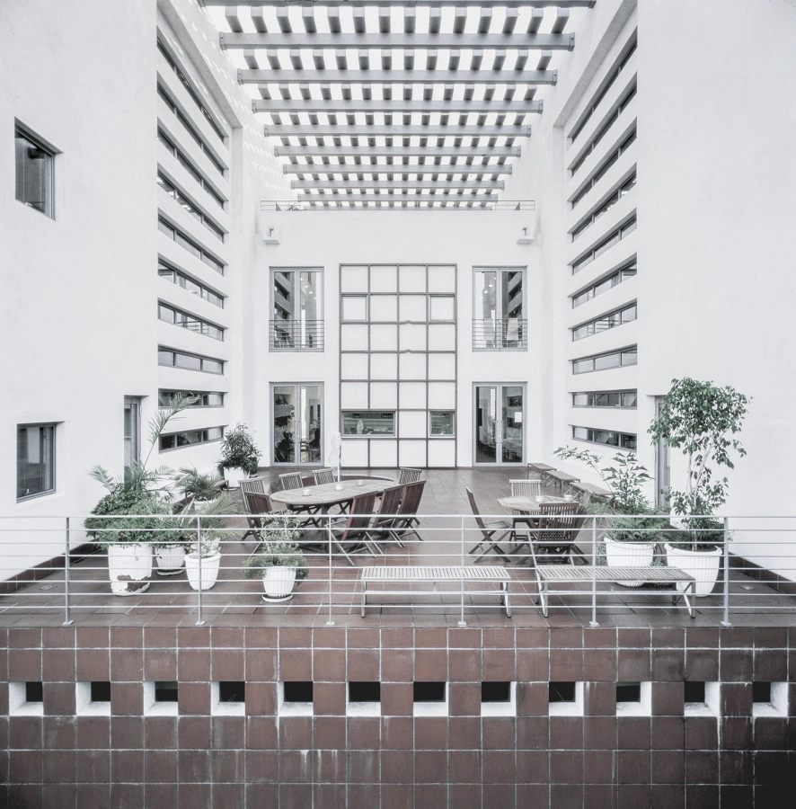 Inspired by the architect Louis Kahn, the roof of the terrace is a steel-slated pergola that cools down the outdoor area by generating natural ventilation from hot air rising from the flooring. Simultaneously, it connects the embassy buildings and symbolises the cooperation between the Nordic countries.