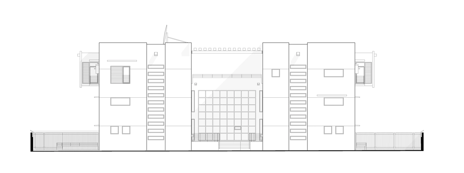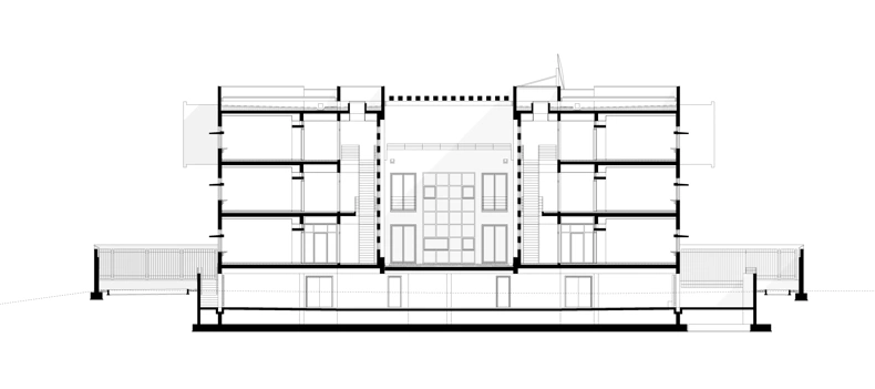 The embassy appears as a streamlined monolith, subdivided into two independent representations with a common building in between. A roof-height steel pergola underpins the concept of an overall entity and the joint facilities that the users share: the library, meeting rooms, the canteen, and the kitchen. In materiality, volume and window proportions, the building relates to the local climate.