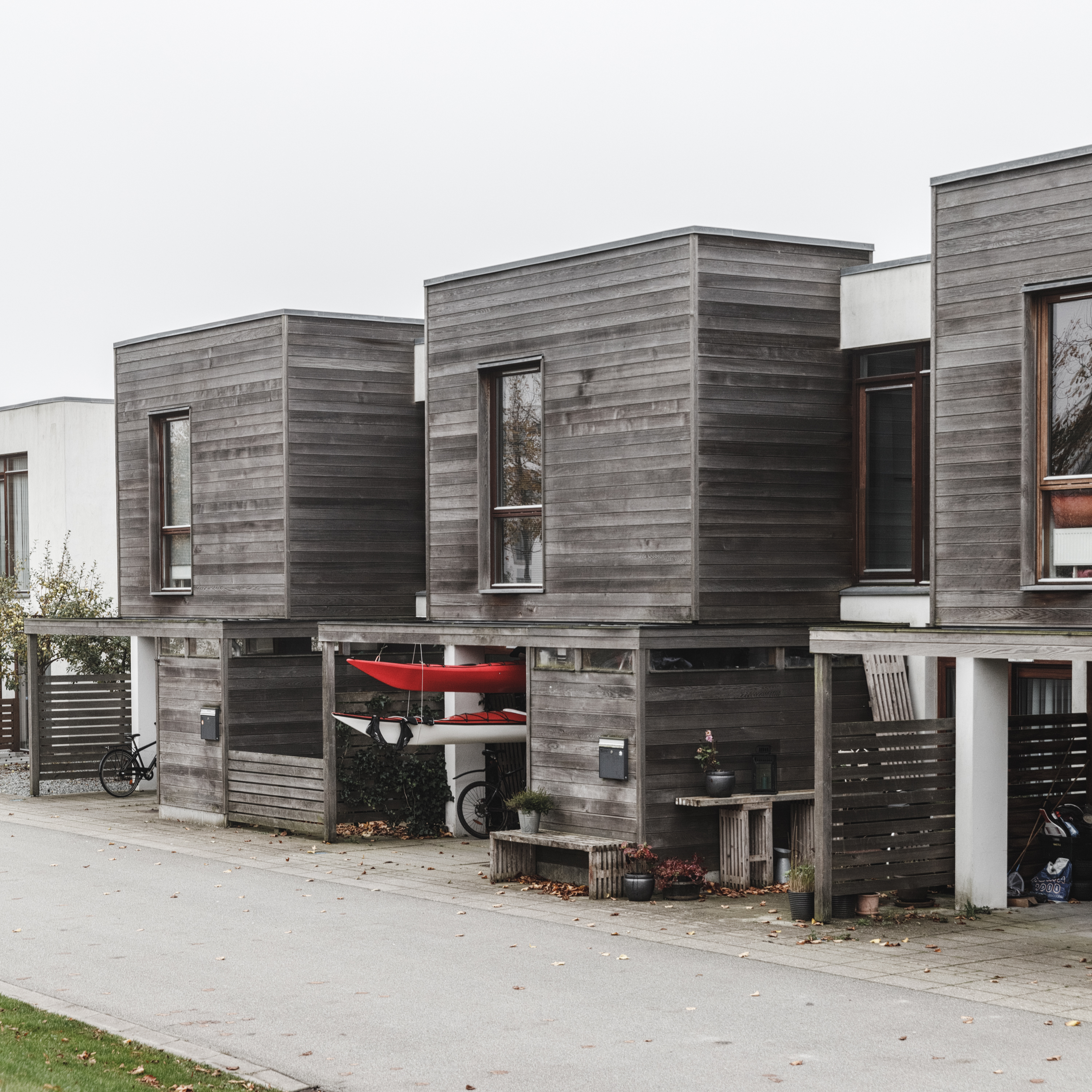 Characterised by simple, bright facades in white plaster with high-quality wooden sections, the street scene is Nordic modernism referencing a classic English village structure with townhouses.