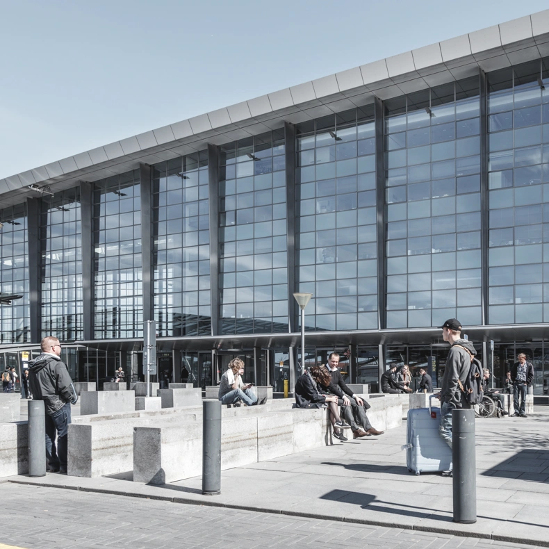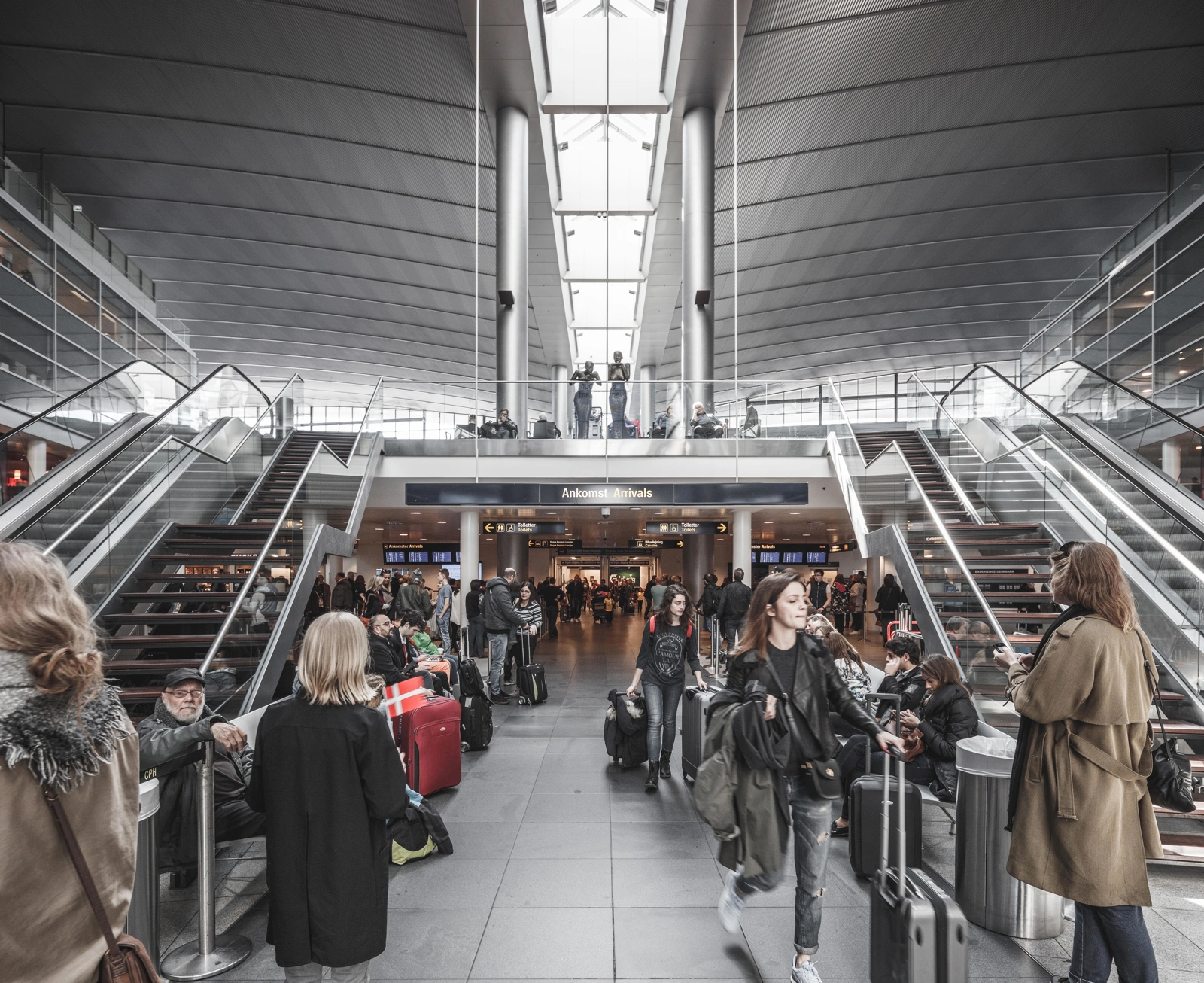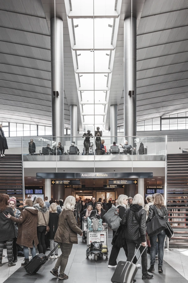 Its widest part contains the arrivals area, which all passengers flying into Copenhagen pass through. The middle part holds the departure area, which 40 per cent of outgoing passengers pass through, while the metro station area is placed at the tip of the triangle, as about 15 per cent of passengers arrive by rail. The train station is situated under the terminal.